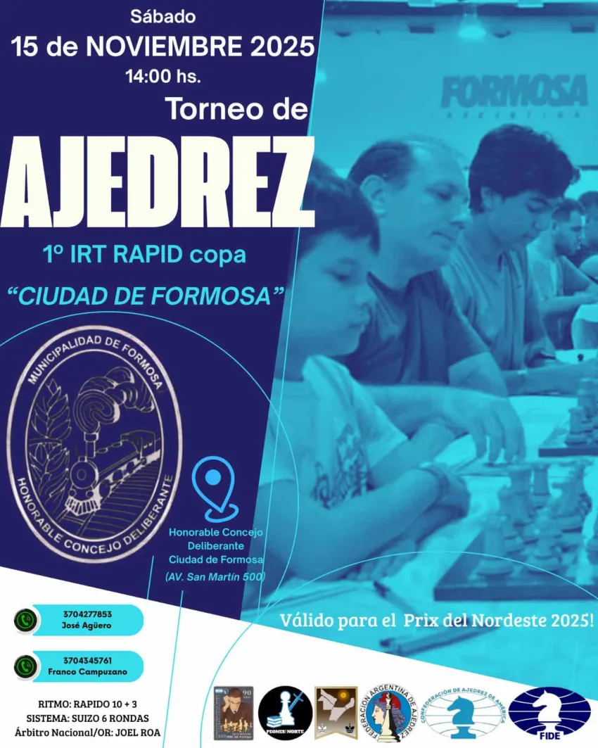Este sábado 15 de noviembre, a partir de las 14 horas, se disputará en la capital provincial el 1º IRT Rápido Copa "Ciudad de Formosa", un torneo oficial de ajedrez que reunirá a jugadores locales y de distintas provincias del nordeste argentino.