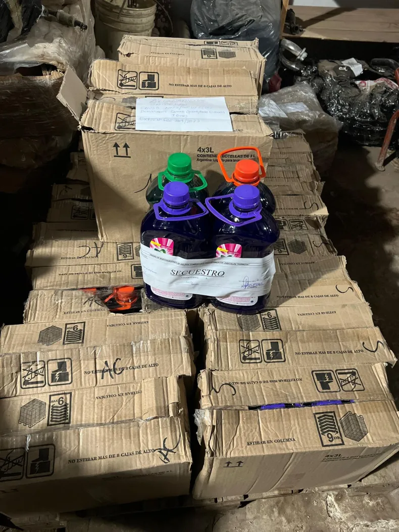 Como resultado de las actuaciones, en uno de los inmuebles se procedió a la incautación de más de 800 cajas que contenían detergentes y jabones líquidos con indicios de falsificación, preparados para su introducción clandestina al mercado paraguayo.