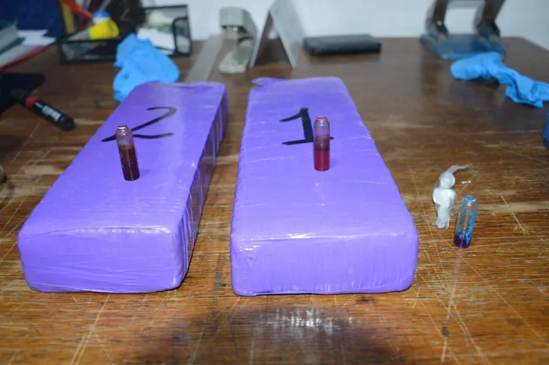 Con apoyo de efectivos de Criminalística y Estudios Forenses de la Unidad, se confirmó que los dos "ladrillos" contenía cannabis sativa dando un peso de 2 kilos 080 gramos, mientras que el envoltorio 077 gramos de cocaína.