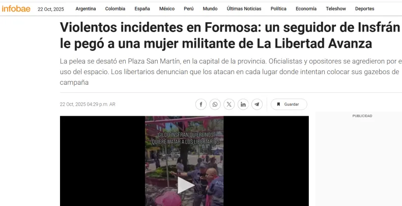 El episodio violento que involucró a la militante de LLA en Plaza San Martín se suma a otros recientes registrados durante la campaña en Formosa. Pocas horas antes del incidente en la mencionada plaza se había denunciado un hecho similar. Militantes libertarios señalaron a seguidores del gobernador Insfrán como responsables de increparlos y restringirles el uso del espacio público, en un patrón que se ha repetido en localidades del interior y en puntos céntricos de la capital provincial. Además denunciaron una agresión física a otro libertario.