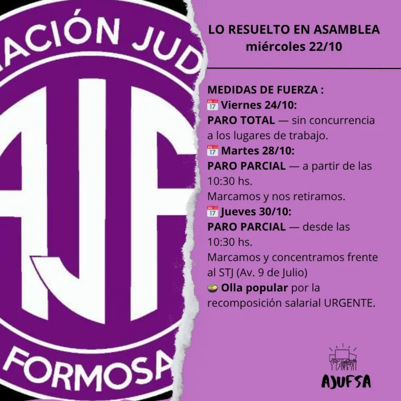 La Asociación Judicial de Formosa cumple este viernes un paro total de actividades, sin asistencia a los lugares de trabajo, en reclamo de una recomposición salarial que consideran "urgente y necesaria". La secretaria general del gremio, Silvia Oruego, confirmó que la medida tiene una adhesión "muy alta" en toda la provincia y que continuarán con paros parciales la próxima semana.