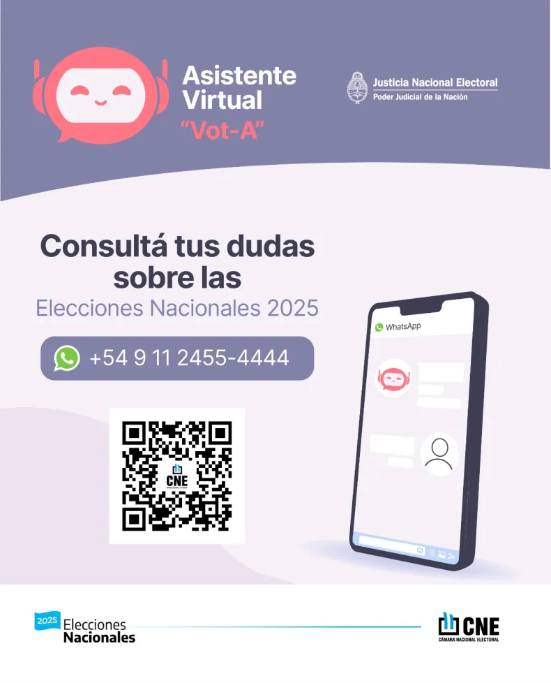 El sistema "Vot-A" funciona mediante WhatsApp, y se accede enviando un mensaje al número +54 9 11 2455 4444 o bien escaneando el código QR disponible en los canales oficiales de la Cámara Nacional Electoral (CNE).