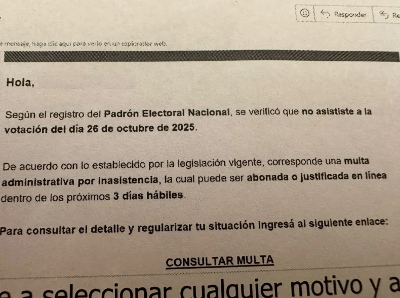 Desde la Justicia Nacional Electoral aclararon que no se envían correos de este tipo y recordaron que la única forma oficial de verificar si se tiene alguna infracción electoral es a través del sitio web: https://infractores.padron.gov.ar.