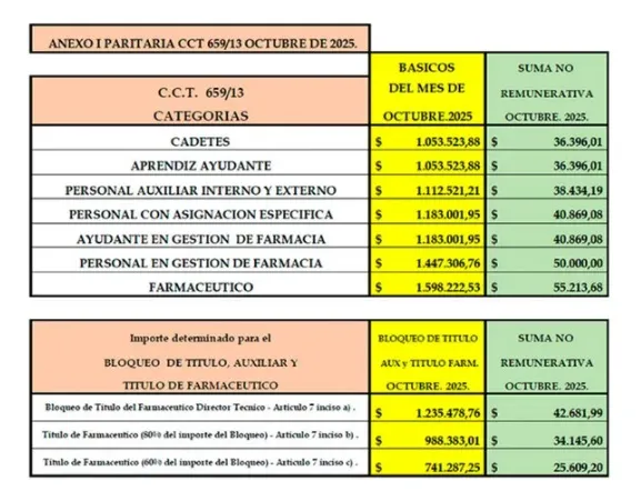 De acuerdo al CCT 659/13, los básicos del mes de octubre se actualizan a $1.053.523,88. Esto representa un aumento del 4,3% en un mes y otro. A diferencia de los meses anteriores, no habrá un bono no remunerativo. De todas formas, este básico es representativo para un cadete y un aprendiz ayudante, mientras que un farmaceútico cobrará de básico este mes $1.598.222,53.