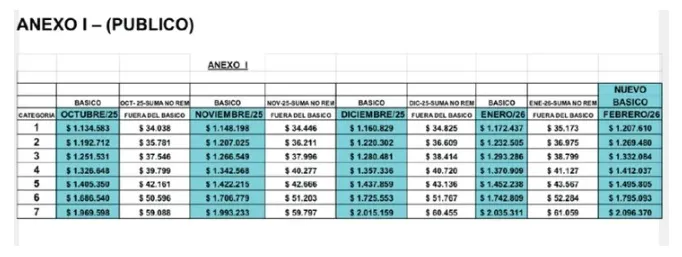 Estas sumas adicionales —que varían según categoría, desde unos $326 a más de $76.000 según el puesto— representan una actualización promedio cercana al 6% mensual sobre los valores básicos actuales. Además, las sumas no remunerativas deberán computarse para el cálculo de aguinaldo, vacaciones y horas extras, aunque no forman parte de los aportes previsionales hasta su pase al básico en 2026.