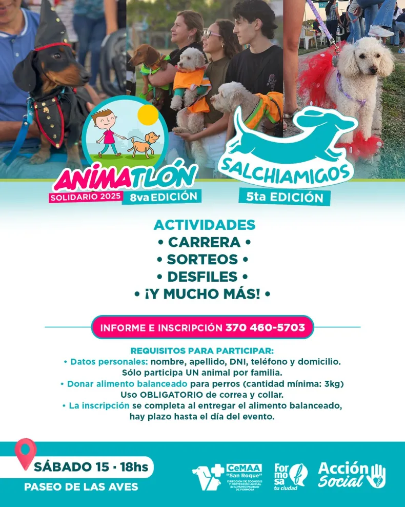 Organizada por Acción Social de la Municipalidad local, este sábado 15,a partir de las 18, se realizará una nueva edición del Animatlón y Salchiamigos en el Paseo de las Aves, dos tradicionales eventos caninos que convocan a una gran cantidad de vecinos y mascotas en una sola fiesta solidaria, en la que se podrá disfrutar de carreras, desfiles y sorteos, entre otras atractivas y divertidas actividades.